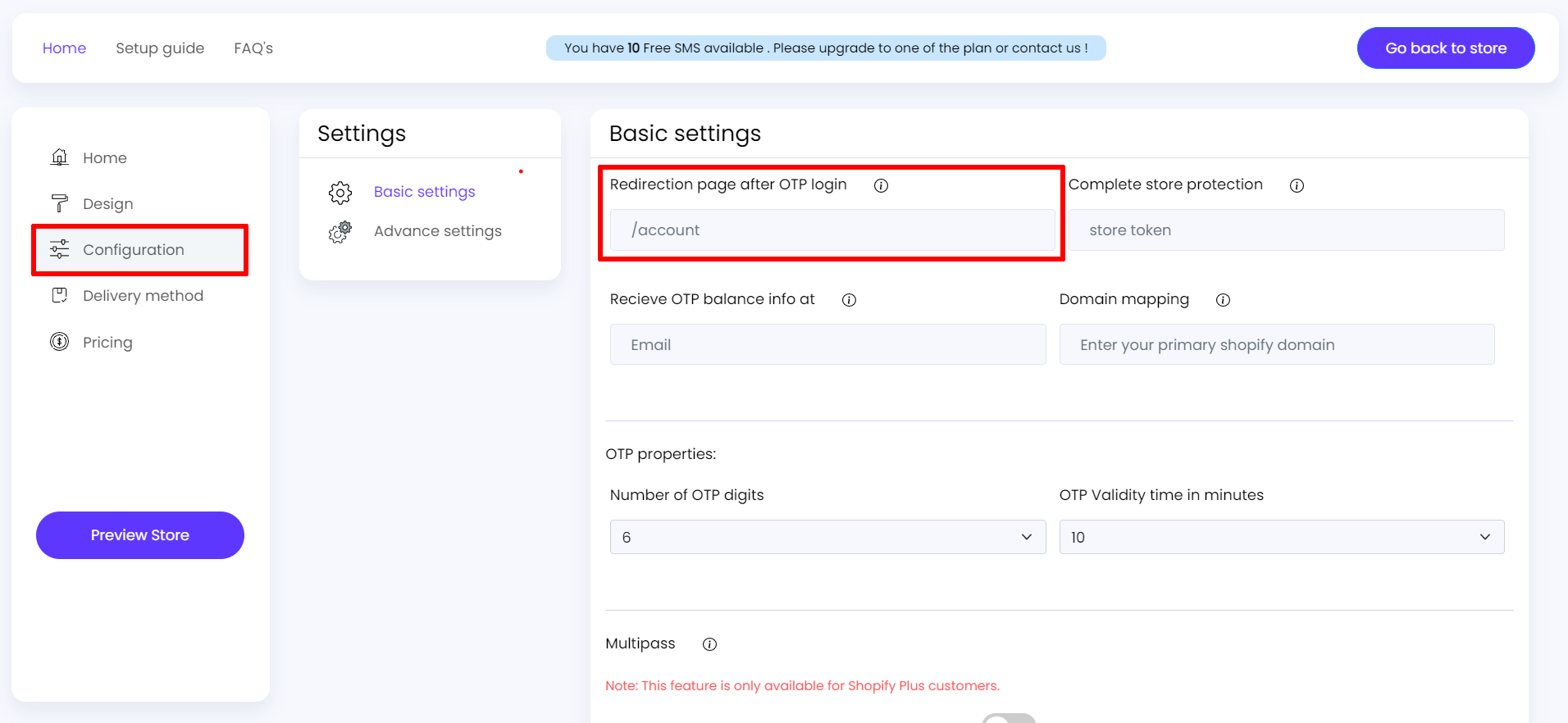 - Now Under the Redirection page after the OTP login section enter the endpoint where you want your customers to be redirected.