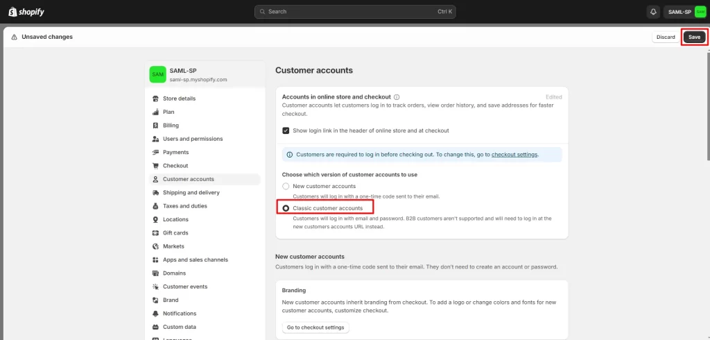 - Enable the Classic customer accounts option and click on Save.