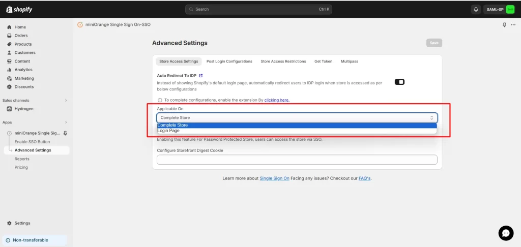 - Navigate to the Advanced Settings tab and enable Auto Redirect to IDP feature under Store Access Settings.