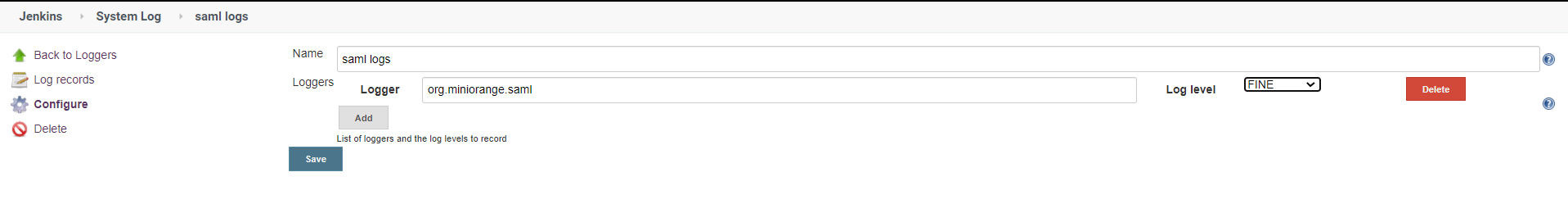 - Add org.miniorange.saml as a Logger and select fine as a log level.